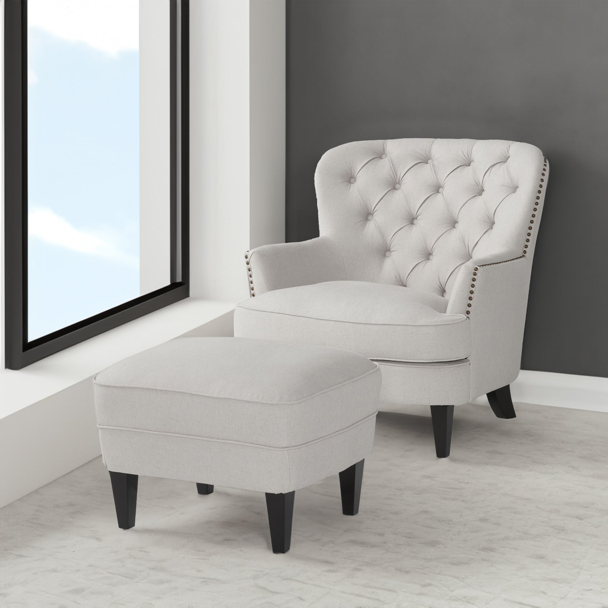 Juego de sillón club y otomana tapizados en tela gris claro modernos