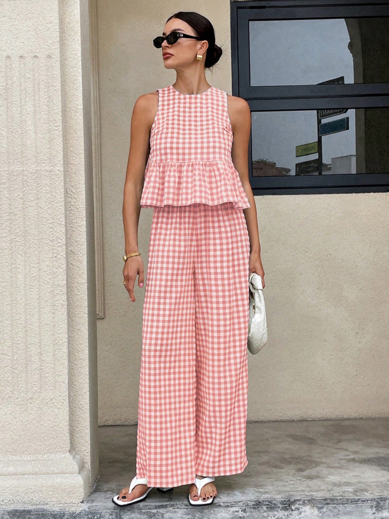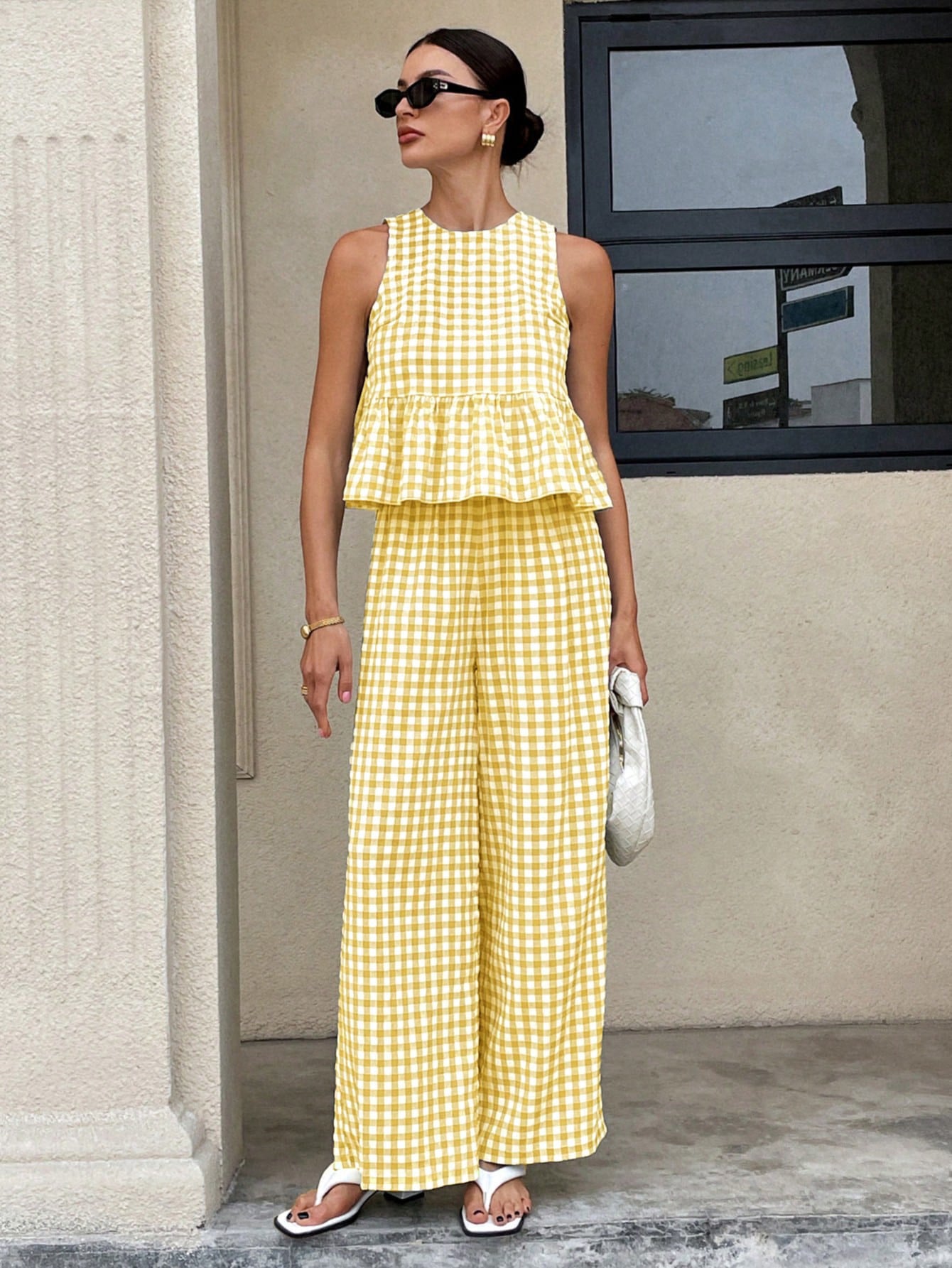 Conjunto de top sin mangas de cuello redondo con bajo de volantes y pantalón de pierna recta para mujer